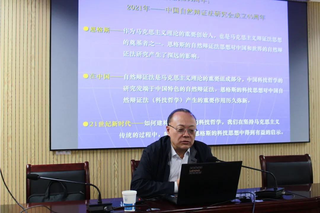 陈凡教授以“恩格斯的科技思想与中国自然辩证法的学科建构与创新发展”为题,紧紧围绕“恩格斯的科技思想”和“中国自然辩证法”这两个关键词展开论述。首先,陈凡教授简单介绍了恩格斯科技思想形成的社会历史条件、思想理论背景和科学技术基础。同时,他指出,目前恩格斯科技思想的研究路径包括马克思恩格斯科技思想一体化研究和恩格斯科技思想的独立研究两条道路。随后,陈凡教授从技术价值和技术批判两个角度阐述了恩格斯科技思想的理论建构。他强调,当前人和自然之间的和解为人与人之间的和解提供了现实基础,但人与自然的和解并不是基于抽象的精神活动,它必须建立在现实的物质生产实践行为上。接着,陈凡教授以时间为序,将中国自然辩证法和科技哲学的发展历程分为学科建构的理论准备、独立学科的形成、曲折发展、学科建制法及创新发展的机遇与挑战这几个阶段。他认为,我国科技哲学发展过程中存在不平衡的问题,包括区域发展不平衡、内外关注不平衡、教学科研不平衡、理论实践不平衡、引进创新不平衡和学术交流不平衡六个方面。最后,陈凡教授从实践根基、理论视域和未来发展三个方面概述了中国特色科技哲学的实现路径,提倡要立足于本土化、面向国际化和促进中国化。
