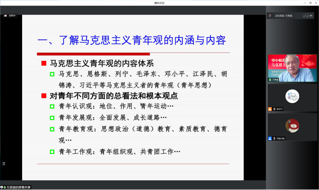 首先,万教授从“马克思主义青年观是什么”“马克思主义青年观与马克思主义青年思想的关系”“马克思主义青年观的内容体系”“对青年不同方面的总看法和根本观点”“马克思主义青年观的研究内容”等方面向大家介绍了马克思主义青年观的内涵。
