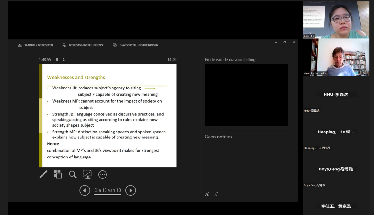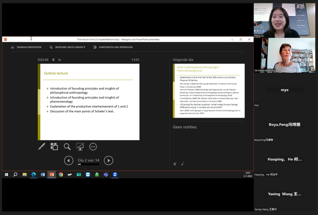 为进一步拓展公司研究生的国际视野、了解国外马克思主义发展前沿、提升员工全球胜任力,公司于6月20日至7月5日开设当代国外马克思主义专题研究国际暑期课程。本次暑期课程采取线上线下相结合的方式,邀请荷兰拉德堡德大学哲学系维罗妮卡·法斯特林教授进行线上授课,公司王朝璐老师、刘沛妤老师线下开展预备课程。听课学员既有本院部分本科生、硕士生和博士生,又有来自其他公司的本科生,也有来自武汉大学、东南大学、湘潭大学等公司的教师和研究生。