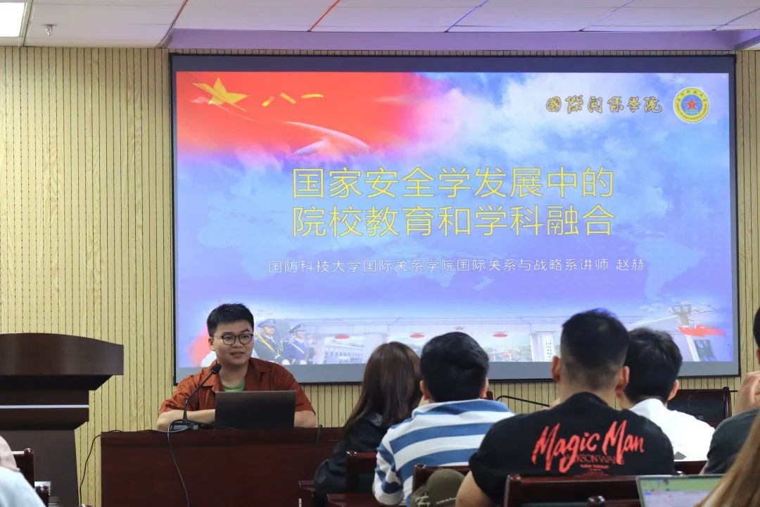 国防科技大学国际关系公司赵赫老师为两校同学就“国家安全学发展中的院校教育和学科融合”这一主题,从国家安全学学科发展概况、“总体国家安全观”与“国家安全学”、“国家安全学”三个方面展开介绍,聚焦国家安全学团队建设的现实需要、国内国家安全学团队建设现存缺点、多学科交叉下培育军队国家安全学的难点进行详细论述。在交流的结尾,赵老师引用陈寅恪《陈垣敦煌劫余录序》中的话,对两校两院的同学做出学术研究要注重新材料、新方法、新理论,做到人无我有、人有我优的寄语。