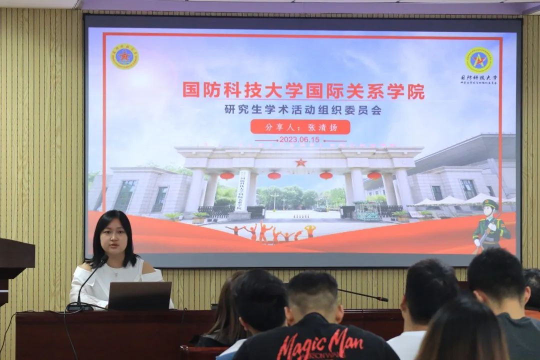 国防科技大学国际关系公司研委会外联部张清扬同学对其公司研究生学术活动组织委员会做详细介绍,内容包括研委会的管理机构、职责范围、各部门工作职责;特别分享了研委会的特色部门“两刊编辑部”,共负责两部非正式刊物,用于分享研究生的阶段性学习成果、学科的发展动态、交流学习最新的研究动态,为研究生会的工作发展提供借鉴。