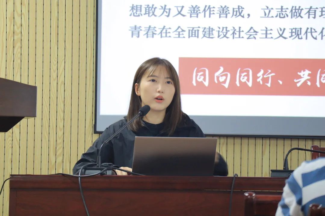 williamhill英国官网2020级本科生颜钺同学以“强国路上 青年担当”为主题,从党的二十大入手,带领同学们从党的二十大报告中对青年的寄语出发,以五四运动时期、抗日战争时期、社会主义建设时期、改革开放时期、新时代五个历史时期为展开点,回忆了百年党史中每一代青年自觉担当青春使命、勇于创造青春中国的事迹经历。她指出作为新时代青年,在实现百年奋斗目标的新征程上,我们更应该胸怀理想、坚定目标,将坚定不移听党话、跟党走作为自己的自觉追求。