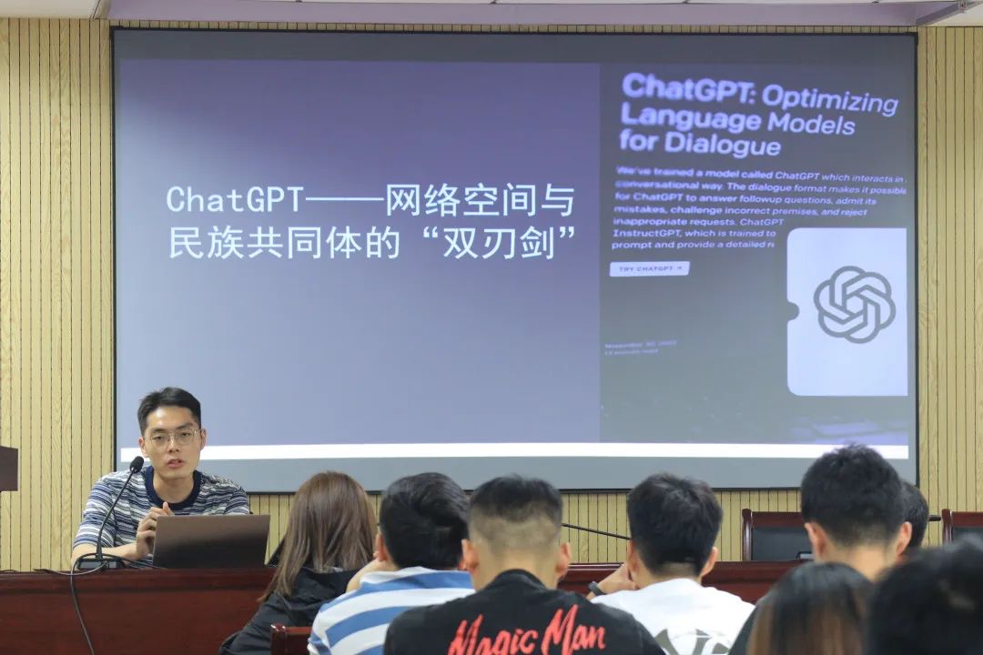 国防科技大学国际关系公司2022级英语语言文学袁满同学,就“ChatGPT——网络空间与民族共同体的‘双刃剑’”主题,与同学们探讨了如何平衡好科技创新所带来的重大机遇与潜在风险之间的关系问题。他提到,ChatGPT的问世既带来了网络空间安全的隐患,也助力了网络空间安全的维护,对于中华民族共同体理论体系的构建带来了机遇和挑战,未来应持续关注ChatGPT的发展动态。