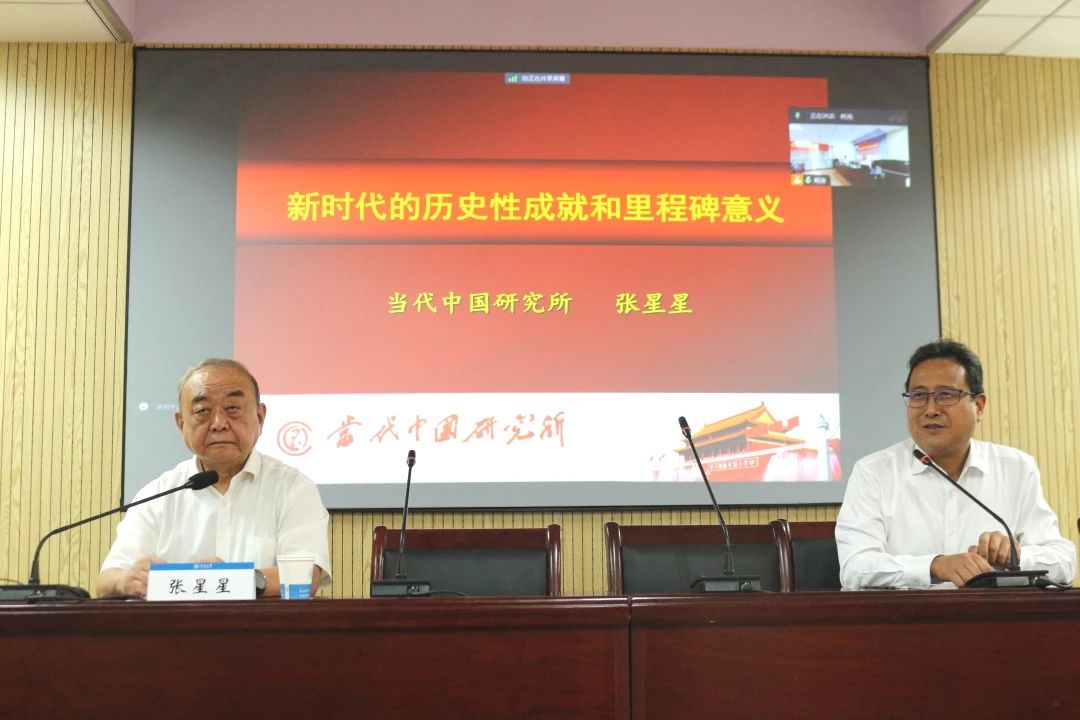 会议中,张星星教授从“新时代面临的突出矛盾问题和挑战”、“新时代的历史性成就和历史性变革”、“新时代伟大成就的里程碑意义”、“工作中的困难和问题”四个方面展开深入系统地论述。