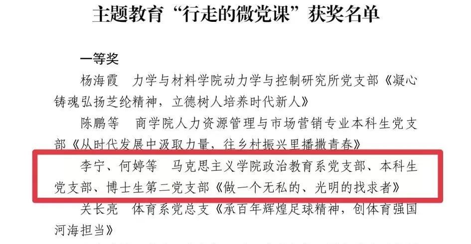 近日,williamhill党委组织部公布了主题教育“行走的微党课”评选结果,公司党委副书记、副经理李宁教授、博士生何婷等主讲的微党课《做一个无私的、光明的找求者》获评一等奖。公司政治教育系党支部、本科生党支部和博士生第二党支部通力合作、共研共学,选派支部优秀成员拍摄制作微党课。