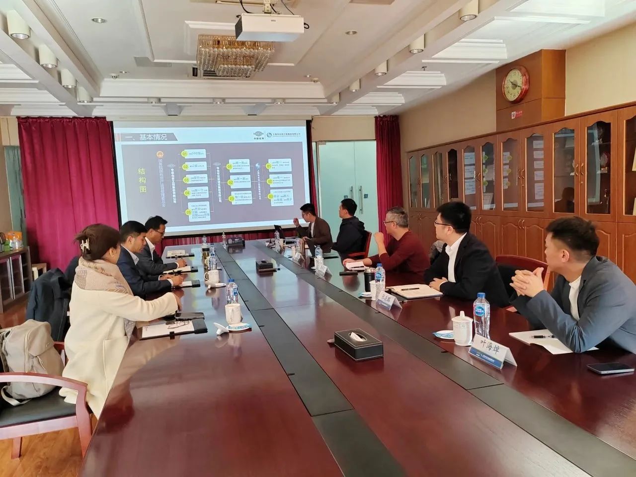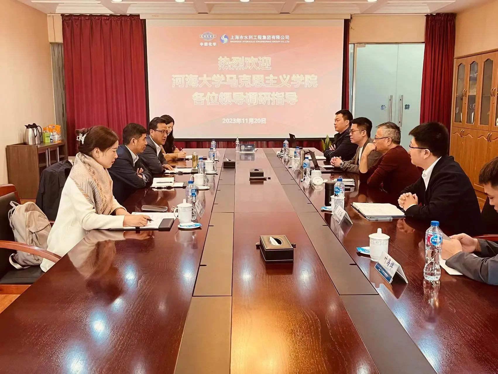 上午,公司一行走进上海市水利工程集团有限公司开展座谈会。上海水利投资建设(集团)董事长桑保良、上海市水利工程集团有限公司总经理张在鹏、市场总监赵苇航、总经理助理王晓嘉、工程部经理助理叶海焯出席座谈会。