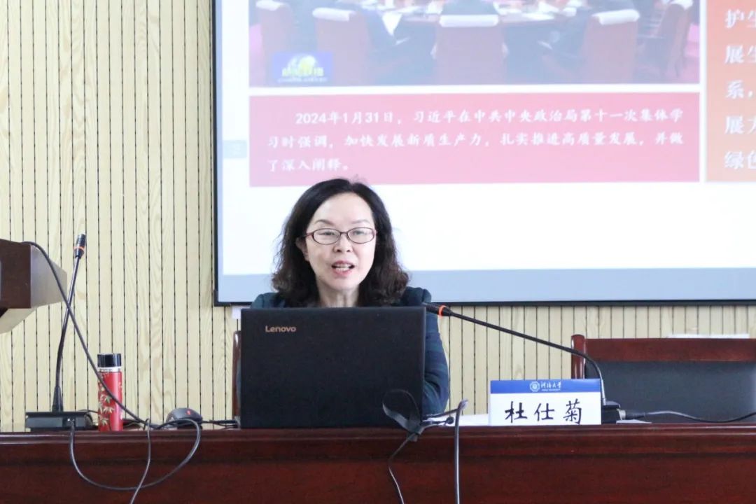 最后,她从新质生产力赋能绿色发展和生态文明建设的角度出发,使同学们清晰地认识到新质生产力赋能绿色发展不仅符合人类文明发展的生态指向,更符合我国具体国情和资源禀赋,指出新质生产力能为解决我国现代化进程中的发展问题提供有效方略,从而助力我国现代化进程。
