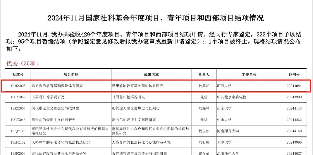 12月4日,全国哲学社会科学工作办公室公布了“2024年11月国家社科基金年度项目、青年项目和西部项目结项情况”,公司williamhill英国官网孙其昂教授主持的国家社科基金重点项目“思想政治教育基础理论体系研究”获批结项,鉴定等级为“优秀”。